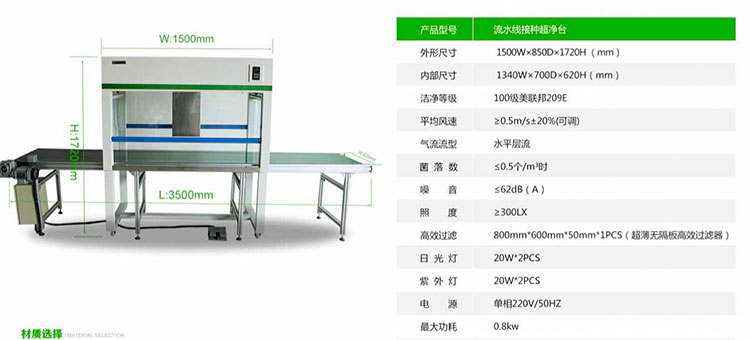 一半以上的客戶選擇食用菌專用流水線接種超凈工作臺,它有怎樣的優(yōu)勢呢?1、食用菌專用流水線接種超凈工作臺設備總長為:3500*620*1720,其中超凈工作臺的尺寸為:1500mm*800mm*1720mm,這樣設計的原因是為了更好的適用食用菌生產(chǎn)工藝的流程。2、食用菌專用流水線接種超凈工作臺采用軟觸點控制面板開關,三擋調(diào)速。3、皮帶末端裝有光電感應,已接種好的菌種不易滑落至地面。4、設備內(nèi)有紫外線和照明燈,開關獨立控制。5、200W國產(chǎn)渦輪蝸桿電機,速比:1:10,變頻調(diào)速,速度2-6 m/min。6、單間輸送產(chǎn)品4KG/件。7、流水線采用電柜箱控制,分為腳踏按鈕和手動按鈕開關控制,設計更人性化。8、皮帶寬度530mm,厚度2mm,綠色防靜電皮帶,皮帶托輥采用304不銹鋼滾筒。